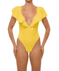 - Detail Feature: Flounce sleeves, Low V-neck, Low back, High cut
