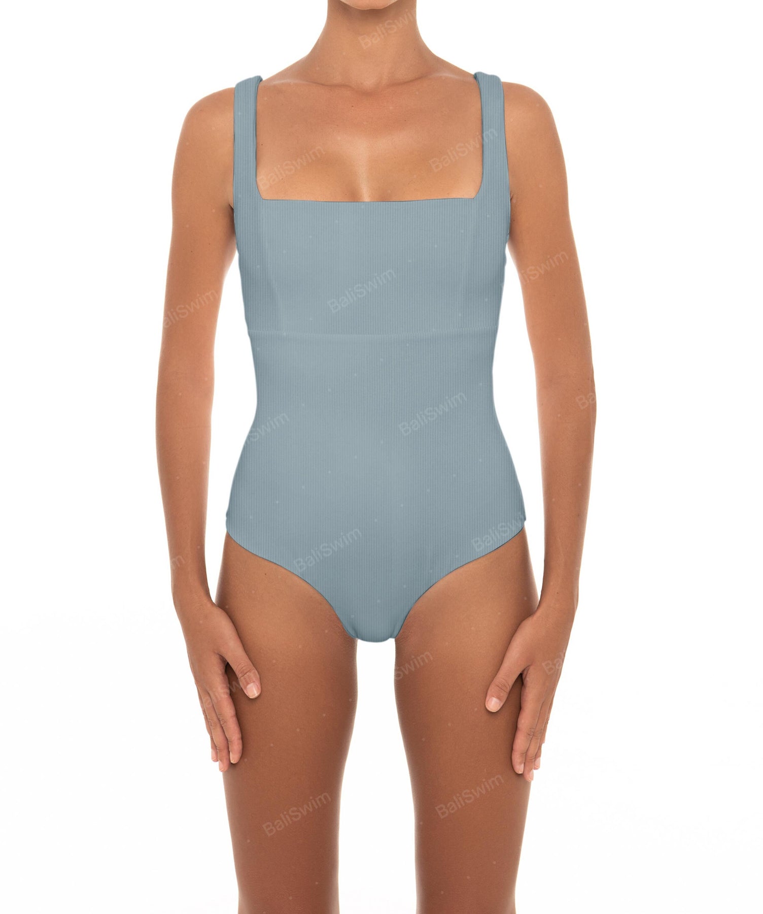 - Detail Feature: Tank one-piece with a square neck, wide shoulder straps, and panel detail