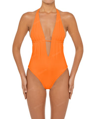 - Detail Feature: Plunge V-neck One piece, Halter ties, Adjustable underbust, Adjustable tie closure, Low back