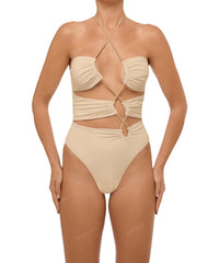 - Detail Feature: Asymmetric cut out one piece, Ruching detail, Adjustable criss cross halter neck