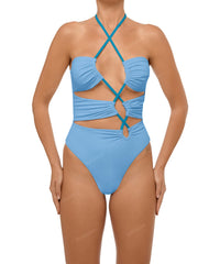 - Detail Feature: Asymmetric cut out one piece, Ruching detail, Adjustable criss cross halter neck