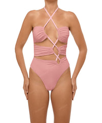 - Detail Feature: Asymmetric cut out one piece, Ruching detail, Adjustable criss cross halter neck