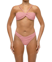 - Detail Feature: Halter bandeau bikini top, Front loop bandeau, Draped detail, Adjustable shoulder straps, Adjustable tie closure