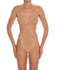 - Detail Feature: High-rise one-piece with a triangle bra, O-ring detail, Side cut-out, and Adjustable shoulder straps
