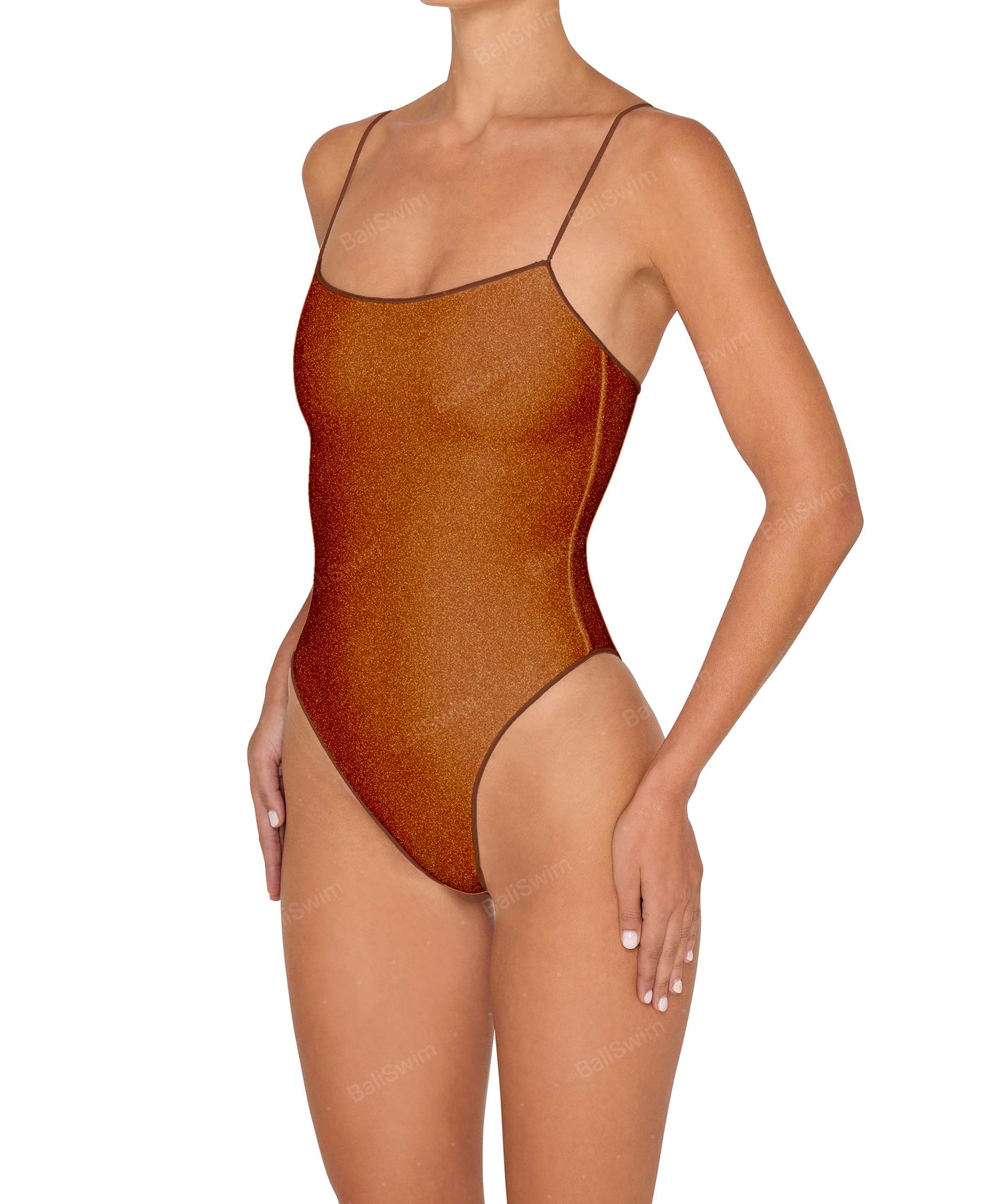 - Detail Feature: Square neckline one piece, with high leg opening, elastic corded straps, and baby lock stitch finishing