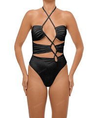 - Detail Feature: Asymmetric cut out one piece, Ruching detail, Adjustable criss cross halter neck