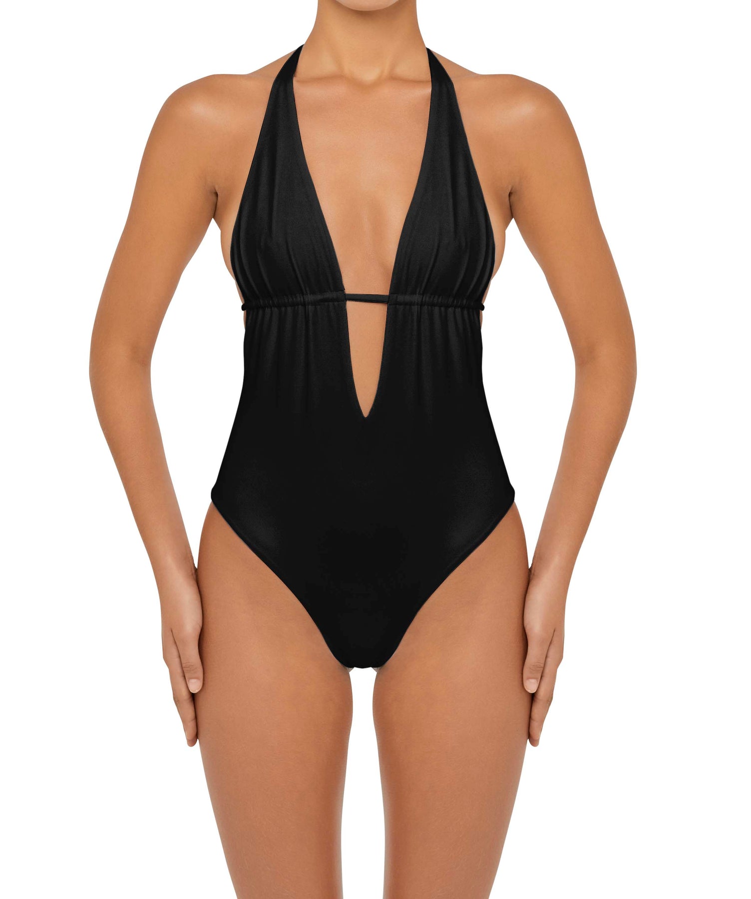 - Detail Feature: Plunge V-neck one-piece with halter ties, adjustable underbust, tie closure, and a low back
