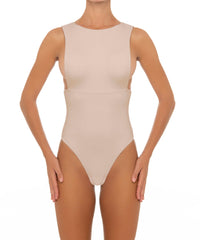 - Detail Feature: One-piece sleeveless rash guard with a high round neck, drop armhole detail, and back zipper opening