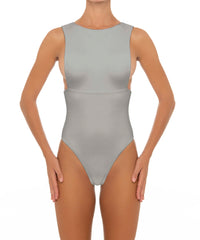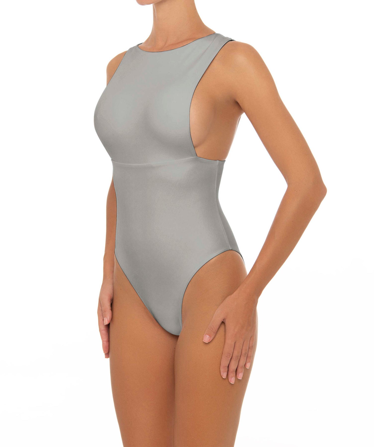 - Detail Feature: One-piece sleeveless rash guard with a high round neck, drop armhole detail, and back zipper opening