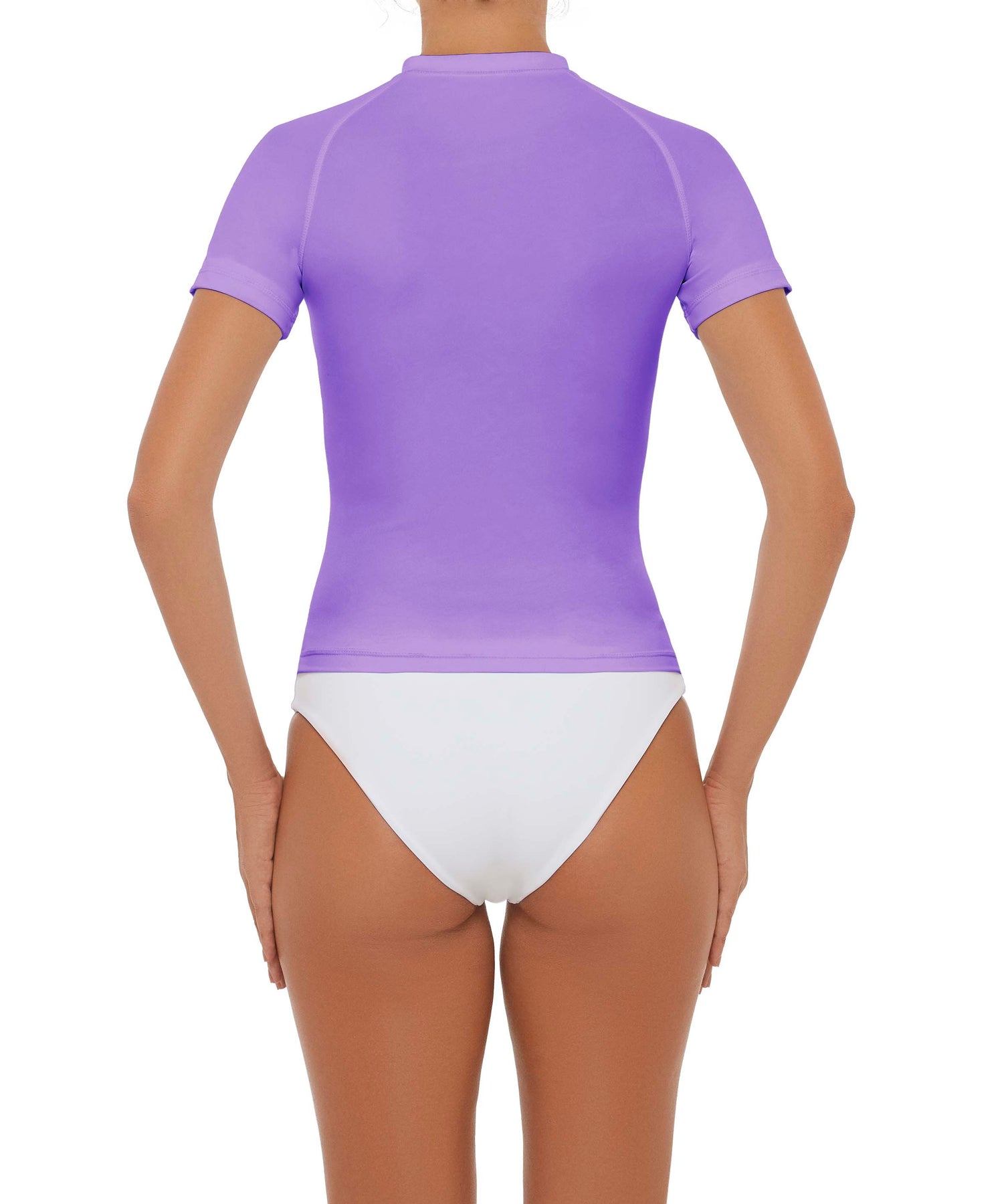 - Detail Feature: Short-sleeve rash guard with raglan sleeves and a half front zipper opening