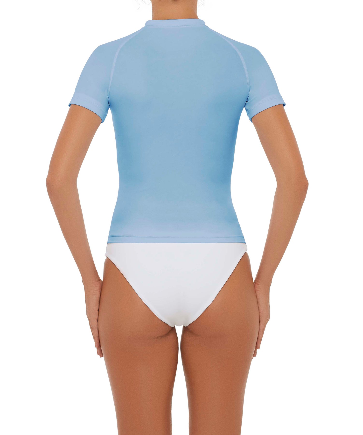 - Detail Feature: Short-sleeve rash guard with raglan sleeves and a half front zipper opening