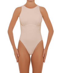 - Detail Feature: Sleeveless rash guard one-piece with a high round neck, curved and gathered bust detail, and a back zipper opening