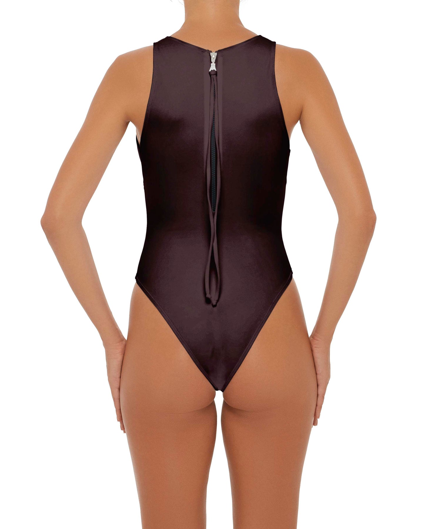 - Detail Feature: Sleeveless rash guard one-piece with a high round neck, curved and gathered bust detail, and a back zipper opening