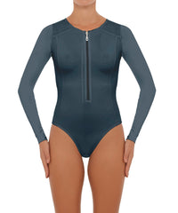 - Detail Feature: Long-sleeve rash guard one-piece with princess line paneling and a front zipper opening