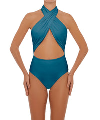 - Detail Feature: Halter crisscross one-piece with adjustable halter ties and a low back
