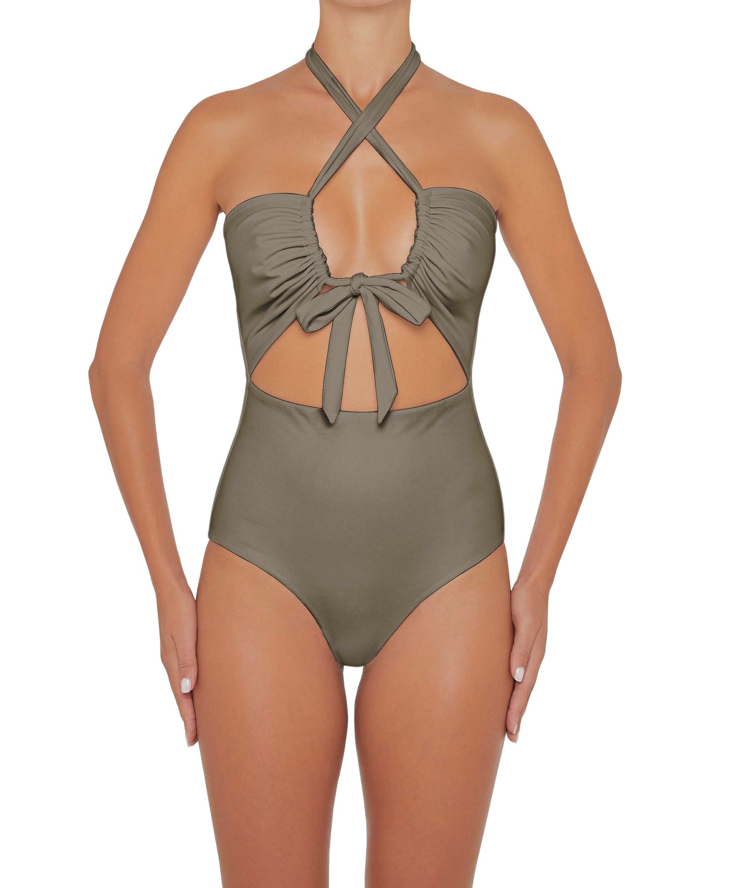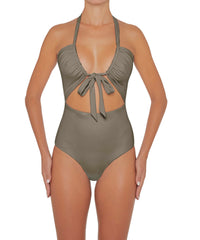 - Detail Feature: Versatile bandeau one-piece with adjustable wide halter ties and a cut-out detail