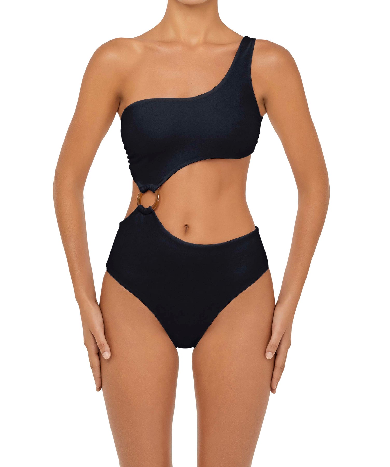 - Detail Feature: Asymmetric one-piece with a one-shoulder design, connecting O-ring cut-out detail, and a high-rise fit