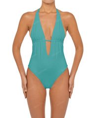 - Detail Feature: Plunge V-neck one-piece with halter ties, adjustable underbust, tie closure, and a low back