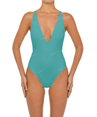 - Detail Feature: Plunge V-neck one-piece with fixed straps, a crisscross wide back strap, and a low back