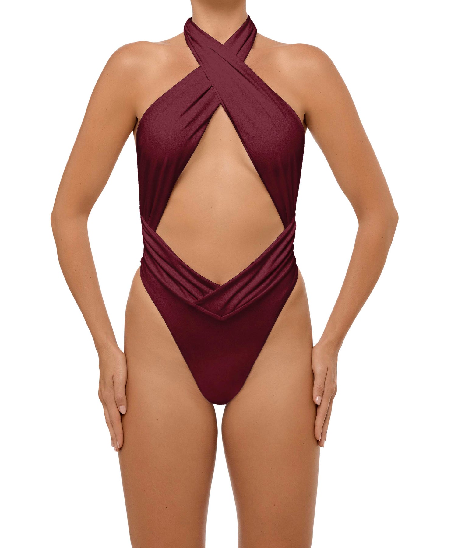 - Detail Feature: Halter cut-out one-piece with crisscross neck, adjustable halter ties, ruched waist and side seams, low V-waist, low back, and a high-cut leg