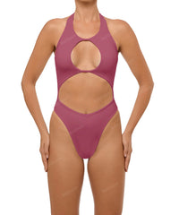 - Detail Feature: High-neck keyhole one-piece with cut-out details and a high-cut leg