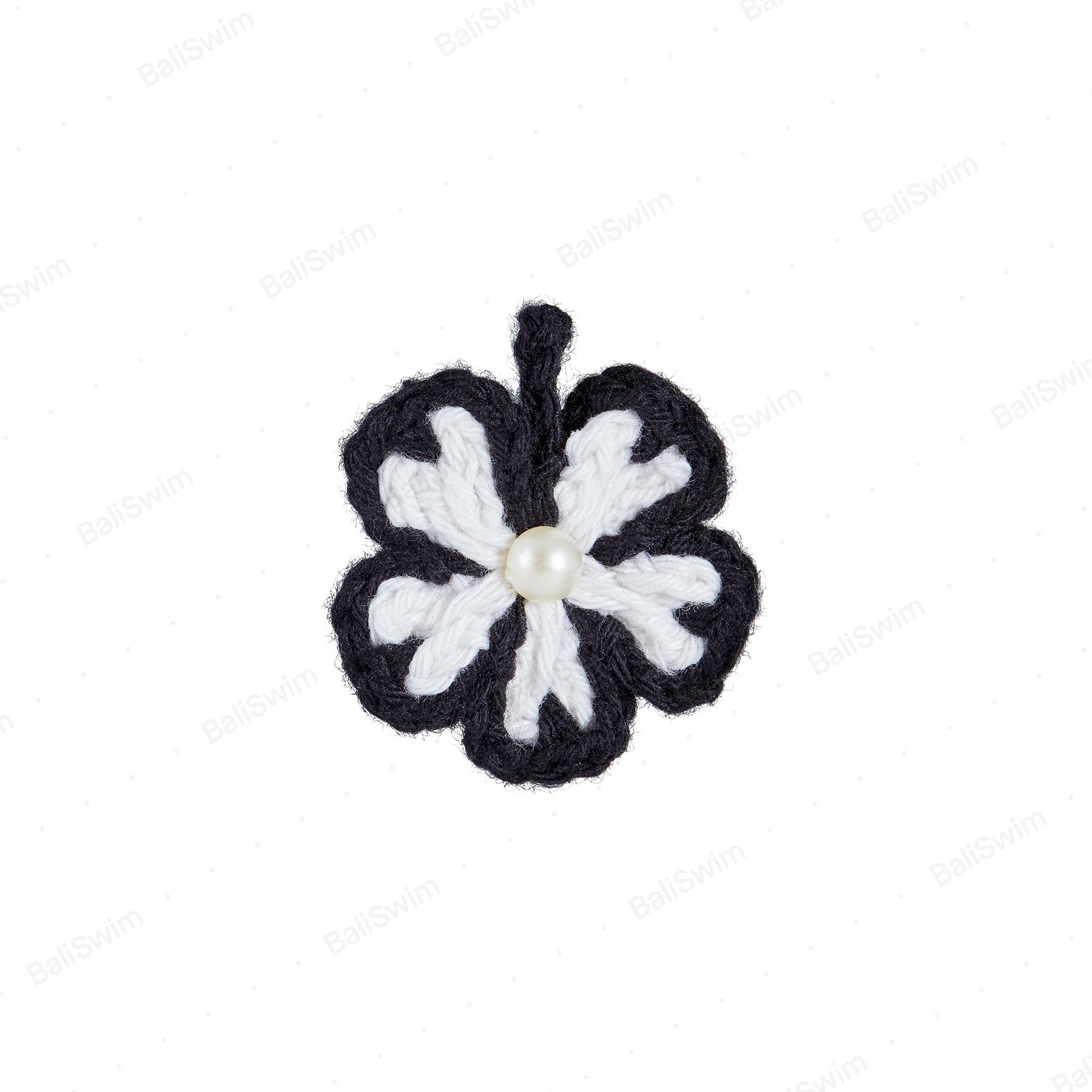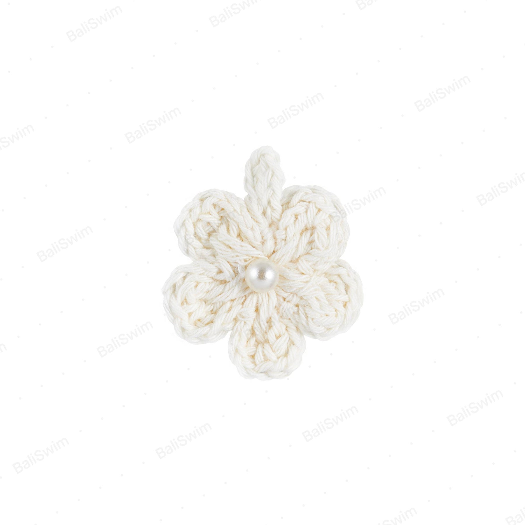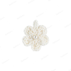 - Description: A delicate hand-crocheted trim featuring five rounded petals with a small pearl at the center. Finished with a small loop in the same crochet material for easy application. The piece measures approximately 3–4 cm in length and width.