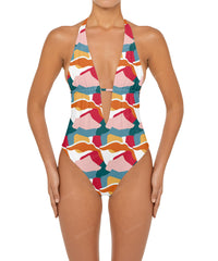 - Detail Feature: Plunge V-neck One piece, Halter ties, Adjustable underbust, Adjustable tie closure, Low back