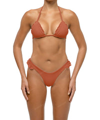 - Detail Feature: Tringle bikini top, Ruffle bust detail, Adjustable halter ties, Adjustable tie closure