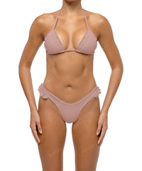 - Detail Feature: Tringle bikini top, Ruffle bust detail, Adjustable halter ties, Adjustable tie closure