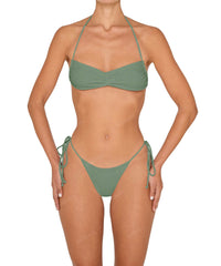 - Detail Feature: Halter bandeau top, center front ruching, with seamless finishing