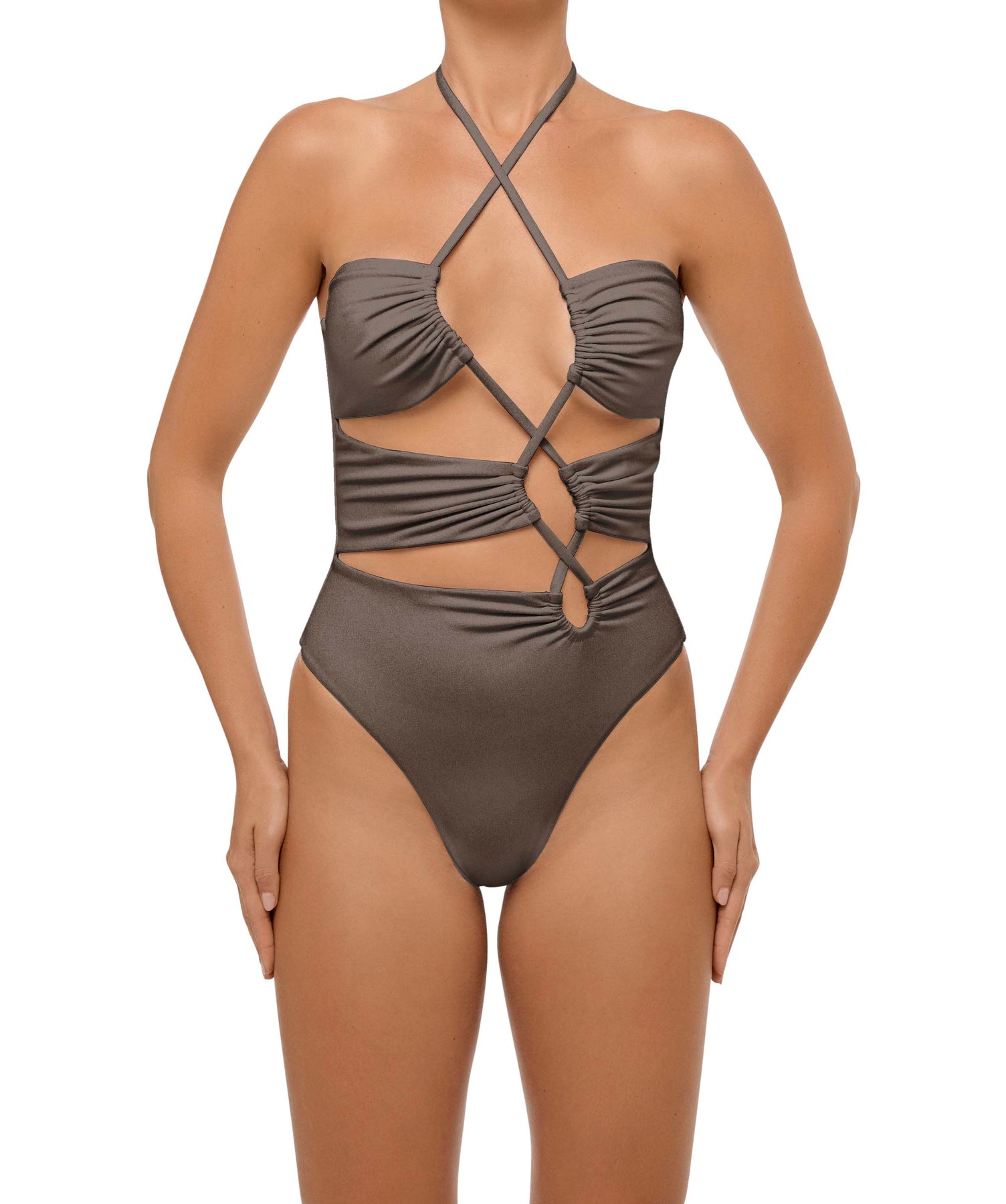 - Detail Feature: Asymmetric cut-out one-piece with ruching detail and an adjustable crisscross halter neck