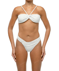- Detail Feature: Halter bandeau bikini top, Front loop bandeau, Draped detail, Adjustable shoulder straps, Adjustable tie closure