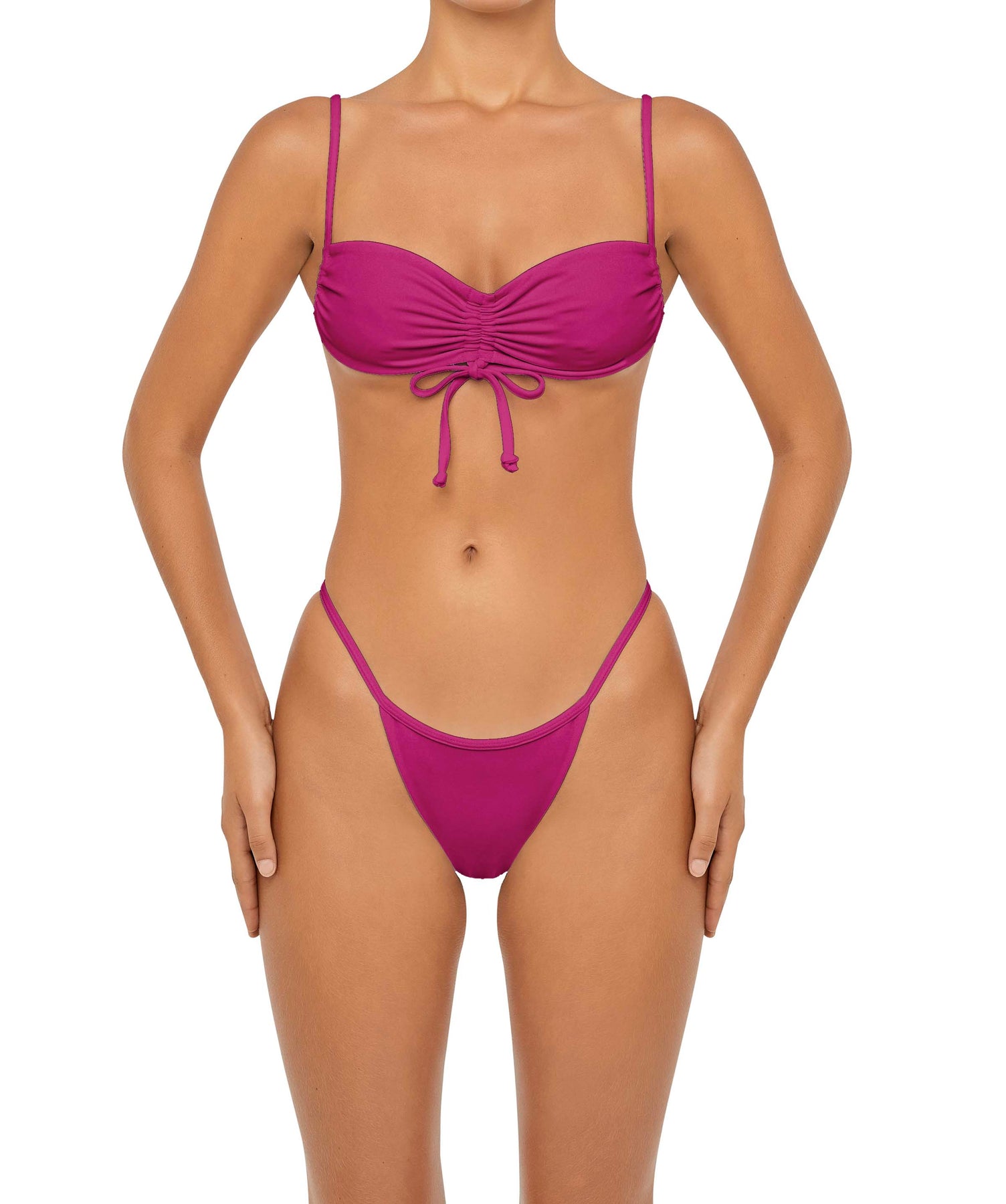 - Detail Feature: Adjustable Gathered bikini top, Adjustable tie closure, Adjustable side cup
