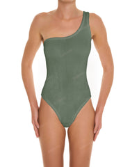 - Detail Feature: High-rise one-piece with asymetrical shoulder detail