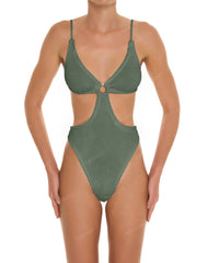 - Detail Feature: High-rise one-piece with a triangle bra, O-ring detail, Side cut-out, and Adjustable shoulder straps