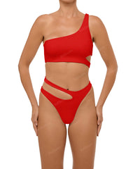 - Detail Feature: Asymmetric cut out bikini bottom, Mid rise, High cut