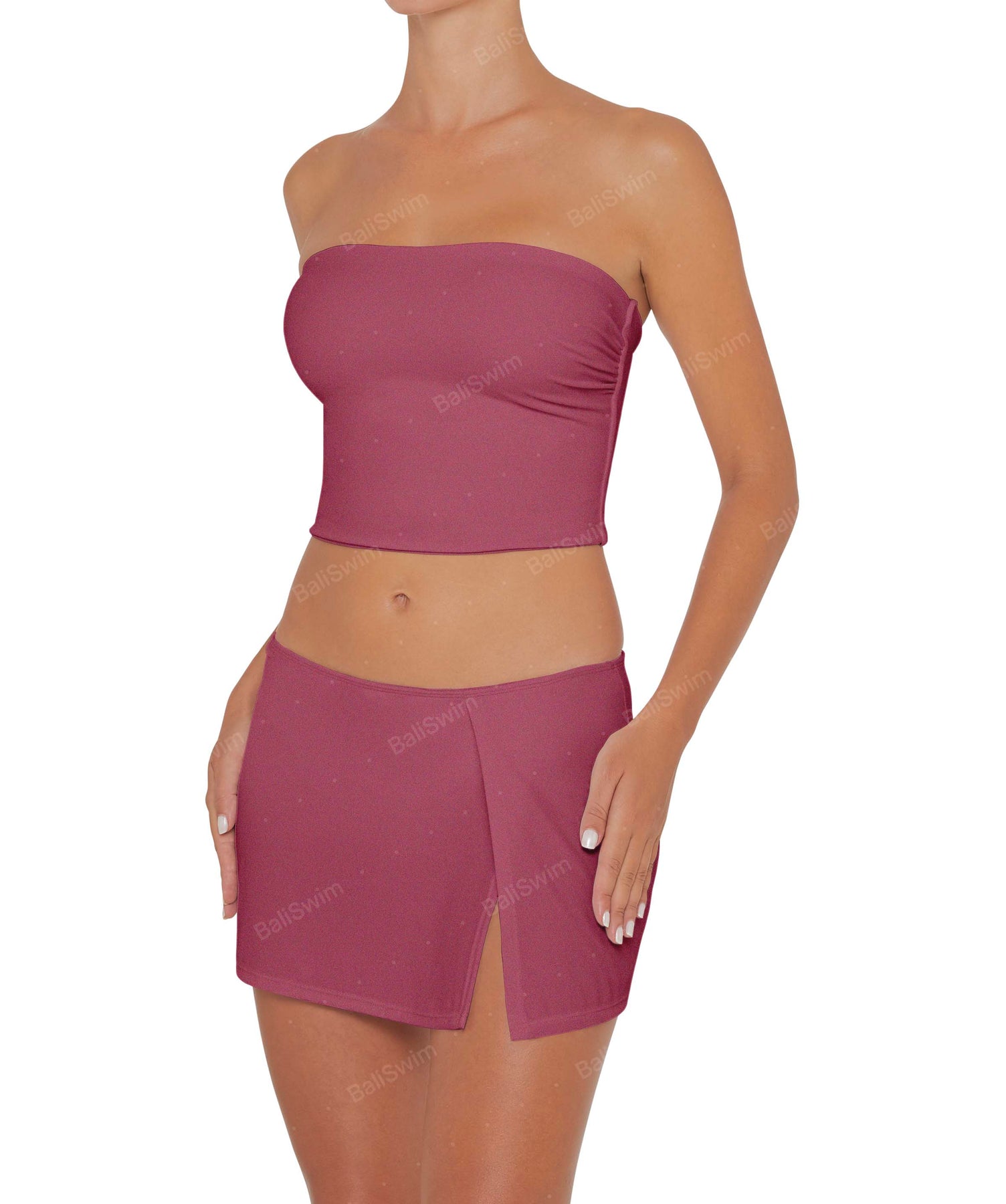- Detail Feature: Swim skirt bottom with an Attached basic bikini bottom and a Slit detail