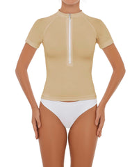 - Detail Feature: Short-sleeve rash guard with raglan sleeves and a half front zipper opening