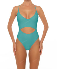 - Detail Feature: Peek a boo one-piece with a V-neck, cut-out detail, fixed crisscross straps, and a low back