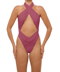 - Detail Feature: Halter cut-out one-piece with crisscross neck, adjustable halter ties, ruched waist and side seams, low V-waist, low back, and a high-cut leg