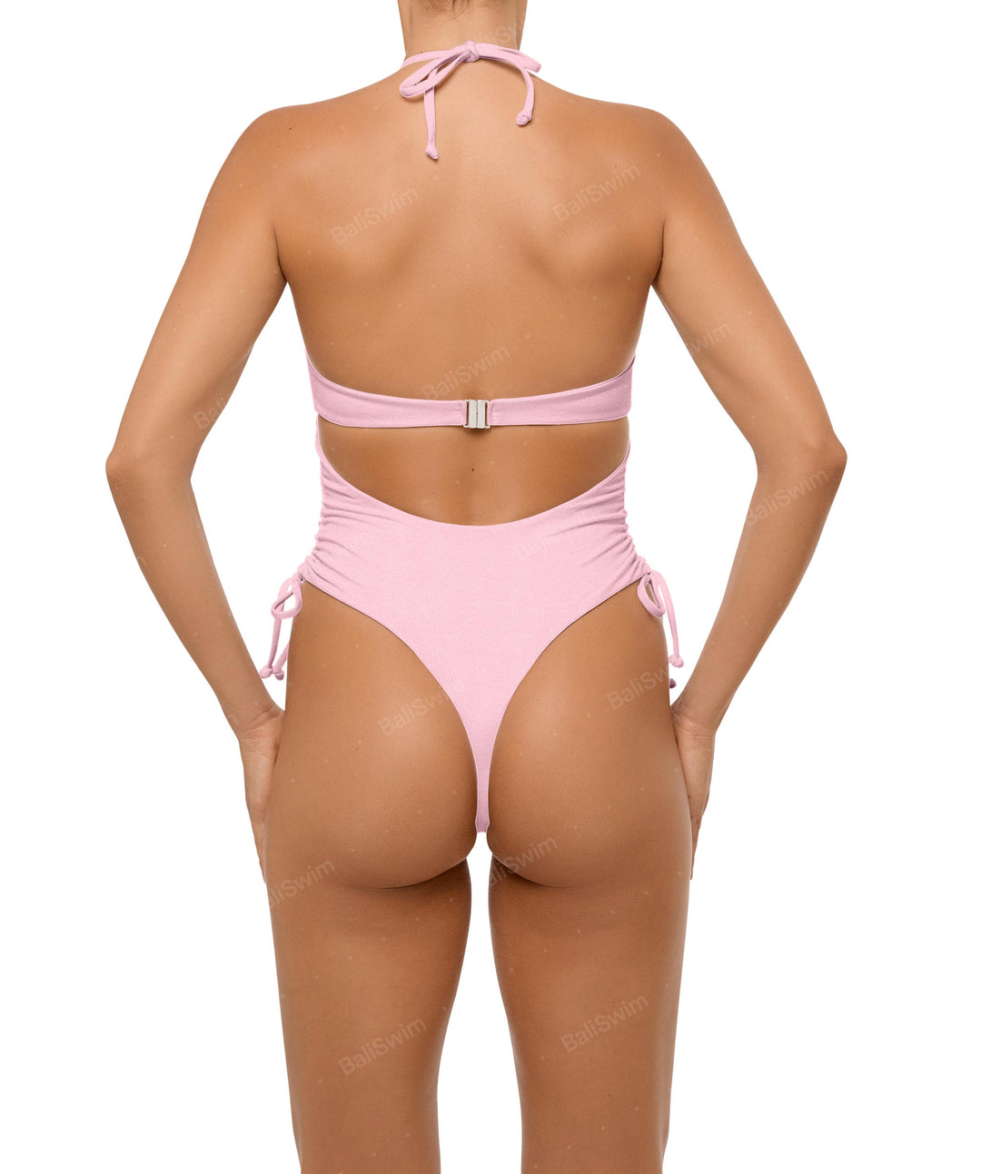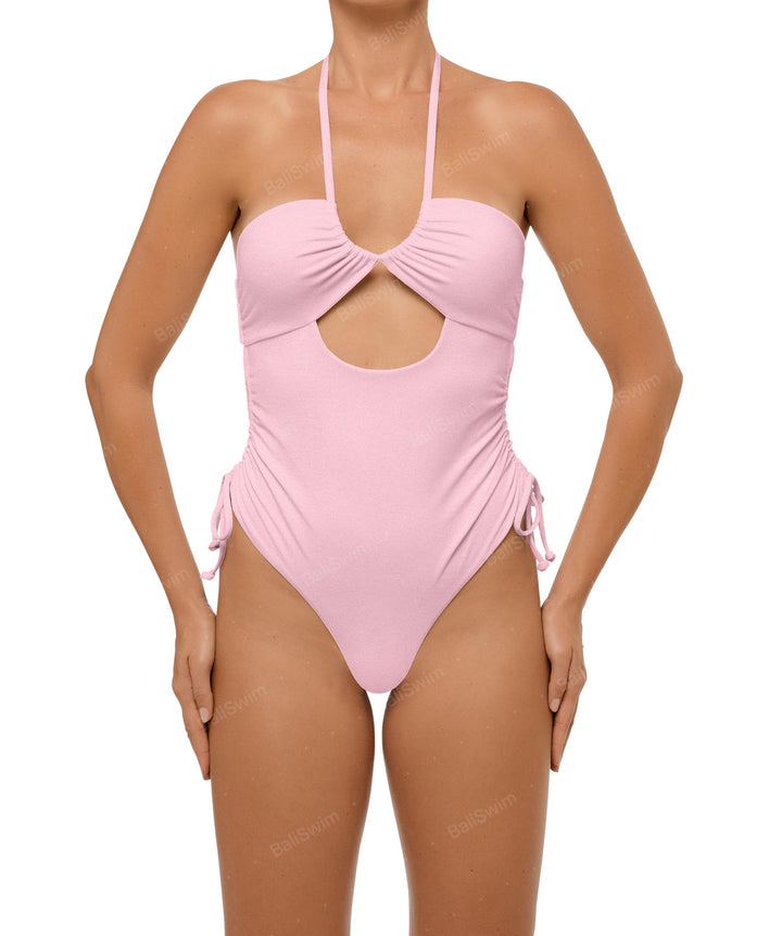 - Detail Feature: Versatile one piece, Adjustable halter ties, Front cutout, Side drawstring, High rise