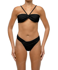 - Detail Feature: Halter bandeau bikini top, Front loop bandeau, Draped detail, Adjustable shoulder straps, Adjustable tie closure