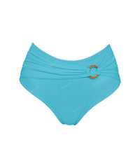 - Detail Feature: High rise bikini bottom, Waist overlay with O-Ring, Ruched detail