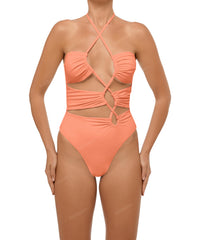 - Detail Feature: Asymmetric cut out one piece, Ruching detail, Adjustable criss cross halter neck