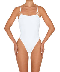 - Detail Feature: Straight neckline one piece, with resin ring details, high leg cut, seamless finishing, option fix straps/ adjustable