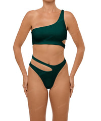 - Detail Feature: Asymmetric cut out bikini bottom, Mid rise, High cut