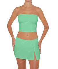 - Detail Feature: Swim skirt bottom, Skirt with basic bikini bottom attached, Slit detail
