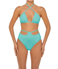 - Detail Feature: High rise bikini bottom, Waist strap accent, High cut