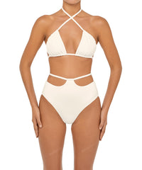 - Detail Feature: High rise bikini bottom, Waist strap accent, High cut
