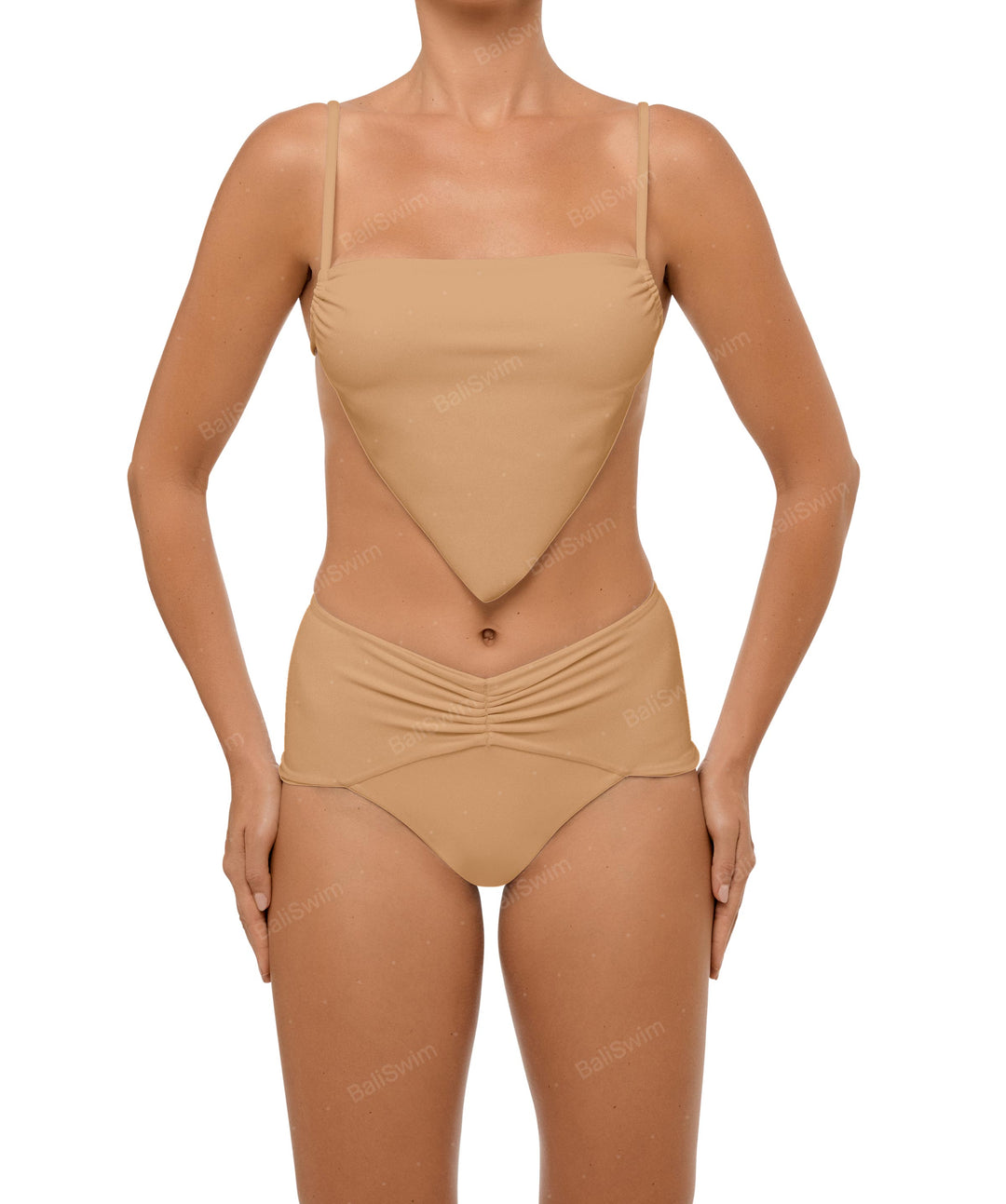 - Detail Feature: High rise bikini bottom, Ruched detail, Wide sideseam, Brief style